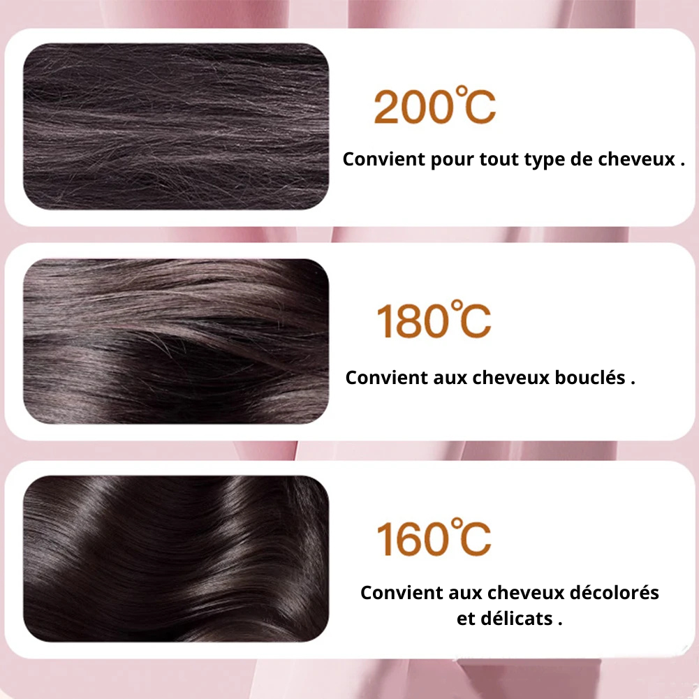 L’appareil dispose de trois niveaux de température: 160°C, 180°C et 200°C. Ces réglages permettent d’adapter la chaleur en fonction de chaque type de cheveux, des plus fins aux plus épais. Le peigne est équipé de dents arrondies et résistantes à la chaleur, facilitant le passage dans les cheveux sans abîmer le cuir chevelu. La température reste stable durant l’utilisation afin d’assurer un lissage homogène.